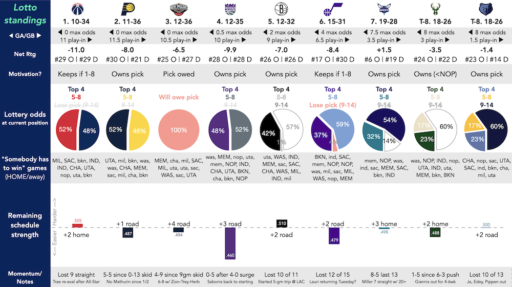 Sacramento definitely has some wins coming with that easy schedule (and with Domantas Sabonis starting to play more). The Hornets look ready to start their climb, with the net rating of a .500ish team and a red hot January. The Pels look pretty competent with their main three guys healthy, and have no reason to ease off the gas.